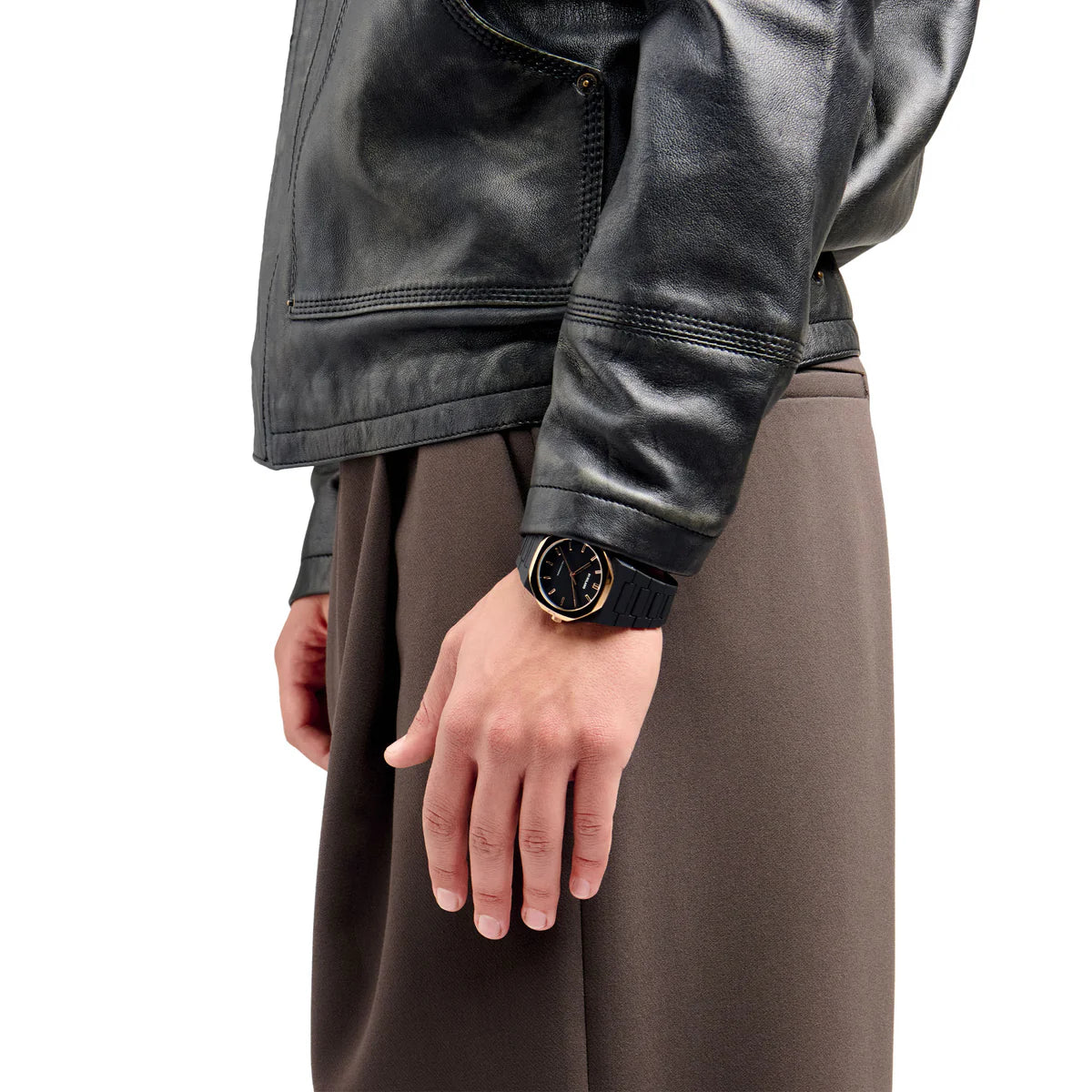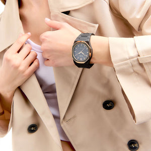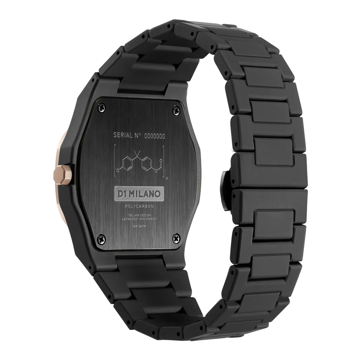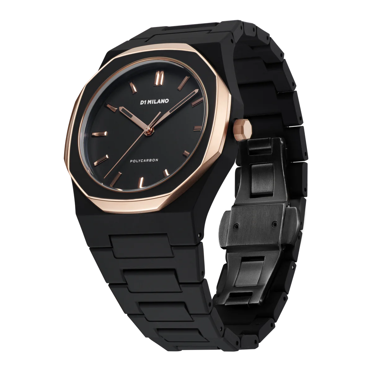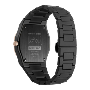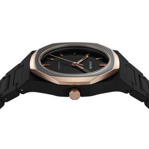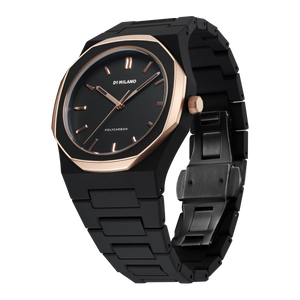A Black Monochromatic color palette mixed with a rose gold coating that confers to the bezel a premium and sophisticated look. Our classic Polycarbon enriched by the enamel finishing on the bezel, makes it even closer to the concept of a design accessory.