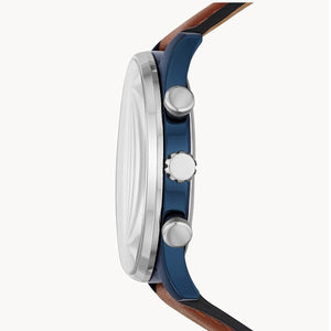 • This 44 mm Sullivan features a blue dial, multifunction movement and a brown leather strap.