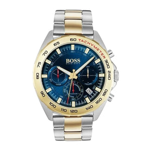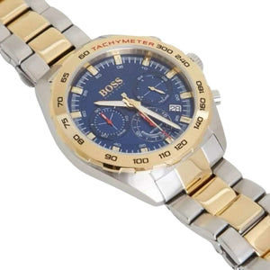 A high-performance watch by BOSS, designed in a mix of stainless steel and yellow-gold plating with luminescent elements for an easy read in the dark. Combining timeless elegance with sporty functionality, this watch features an integrated tachometer, three chronographs and a blue sunray-brushed dial. A masculine link strap and logo-engraved clasp seal off the refined character of this timepiece.