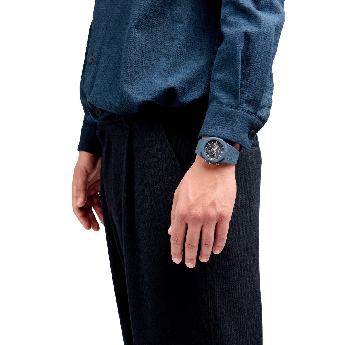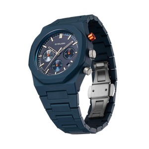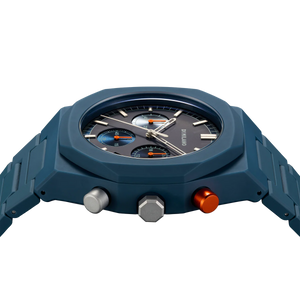 A new interpretation of one of our iconic products: the new Polychrono, in three contemporary variations. The DNA remains, the complication also, the Japanese movement as well, changes everything else. Essential monochromatic with touches of color; subdials arranged in order of brightness, from the lightest to the darkest, with the addition of a sunray finish; contrasting pusher, orange on blue. Just a touch of color, a detail, an unexpected hint: this is who we are.
