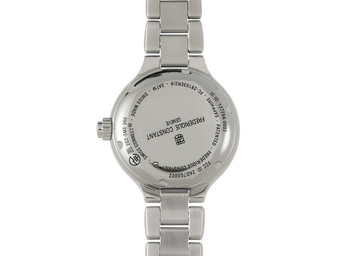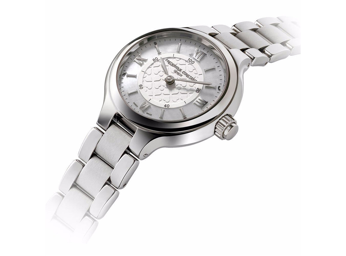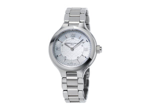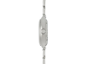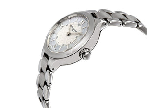 Silver-tone polished stainless steel case with a silver-tone stainless steel bracelet. Fixed silver-tone stainless steel bezel. White mother of pearl dial with luminous silver-tone hands and index hour markers. Roman numerals mrk the 3, 6, 9 and 12 o'clock positions. minute markers around the outer rim, Casual watch style, Watch label: Swiss Made.
