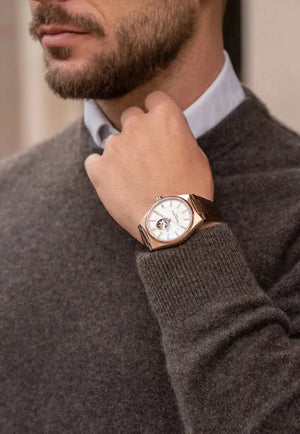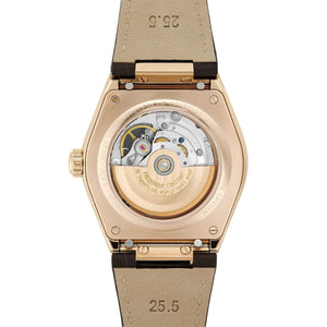 Located at the pole of the globe decoration on the dial, the famous aperture allows those who truly appreciate mechanical timepieces to watch the rotation of the balance wheel in their watch, its beating heart.
