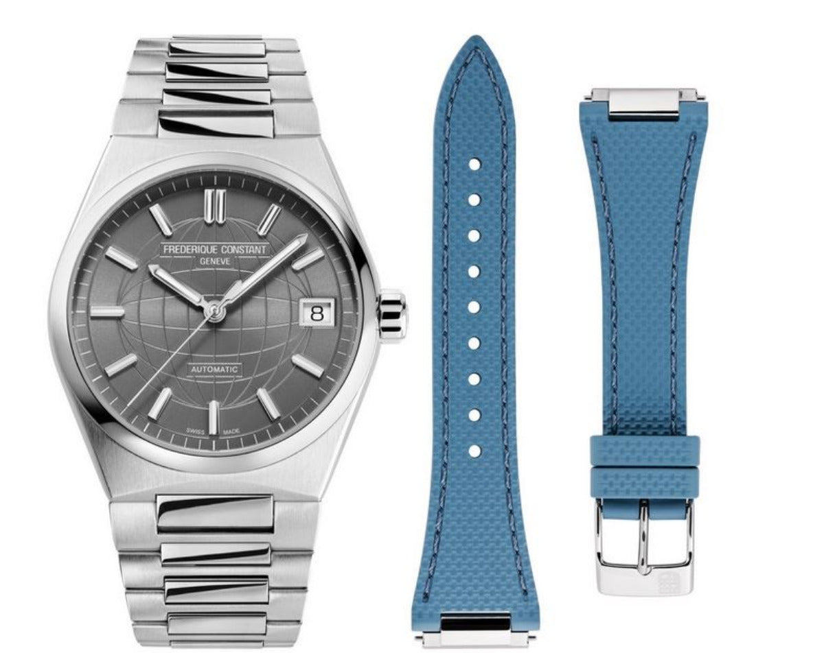 Silver-tone stainless steel case and bracelet. Fixed silver-tone stainless steel bezel. Grey dial with silver-tone hands and index hour markers. Minute markers around the outer rim. Dial Type: Analog. Luminescent hands and markers. Date display at the 3 o'clock position. Frederique Constant Calibre FC-303 Automatic movement, based upon Sellita SW200-1, containing 26 Jewels, bitting at 28800 vph, and has a power reserve of approximately 38 hours. Scratch resistant sapphire crystal. Screw down crown. Transparent see through case back. Round case shape, case size: 34 mm. Fold over clasp with a safety release. Water resistant at 50 meters / 165 feet. Functions: date, hour, minute, second. Highlife Series. Dress watch style. Watch label: Swiss Made. Frederique Constant Highlife Automatic Grey Dial Ladies Watch FC-303LG2NH6B.