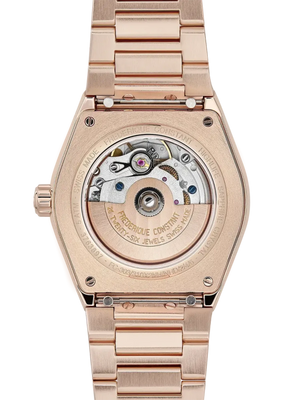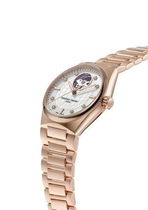 The Highlife Ladies Automatic Heart Beat models capture the legacy of the Manufacture and carry it toward new creative horizons. At 12 o’clock, the pieces proudly display the window on their mechanical heart, made famous by Frederique Constant. Known as the “Heart Beat”, it lets you see the beating heart of the watch, its mechanical movement. It also reveals some essential components of Swiss Made precision.