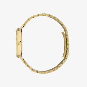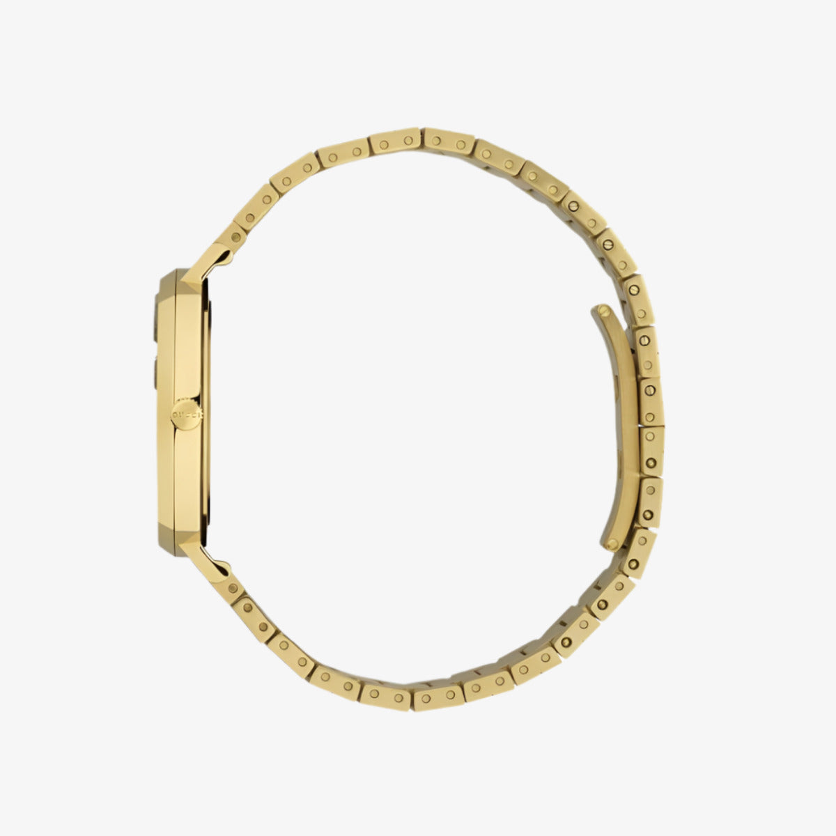 This beautiful timepiece from Gucci is the perfect accessory for any outfit. The silver dial is accented with the signature Gucci bee at the center, and the hour markers are made up of various iconography from the legendary fashion house. The gold tone steel case and bracelet complete the look.