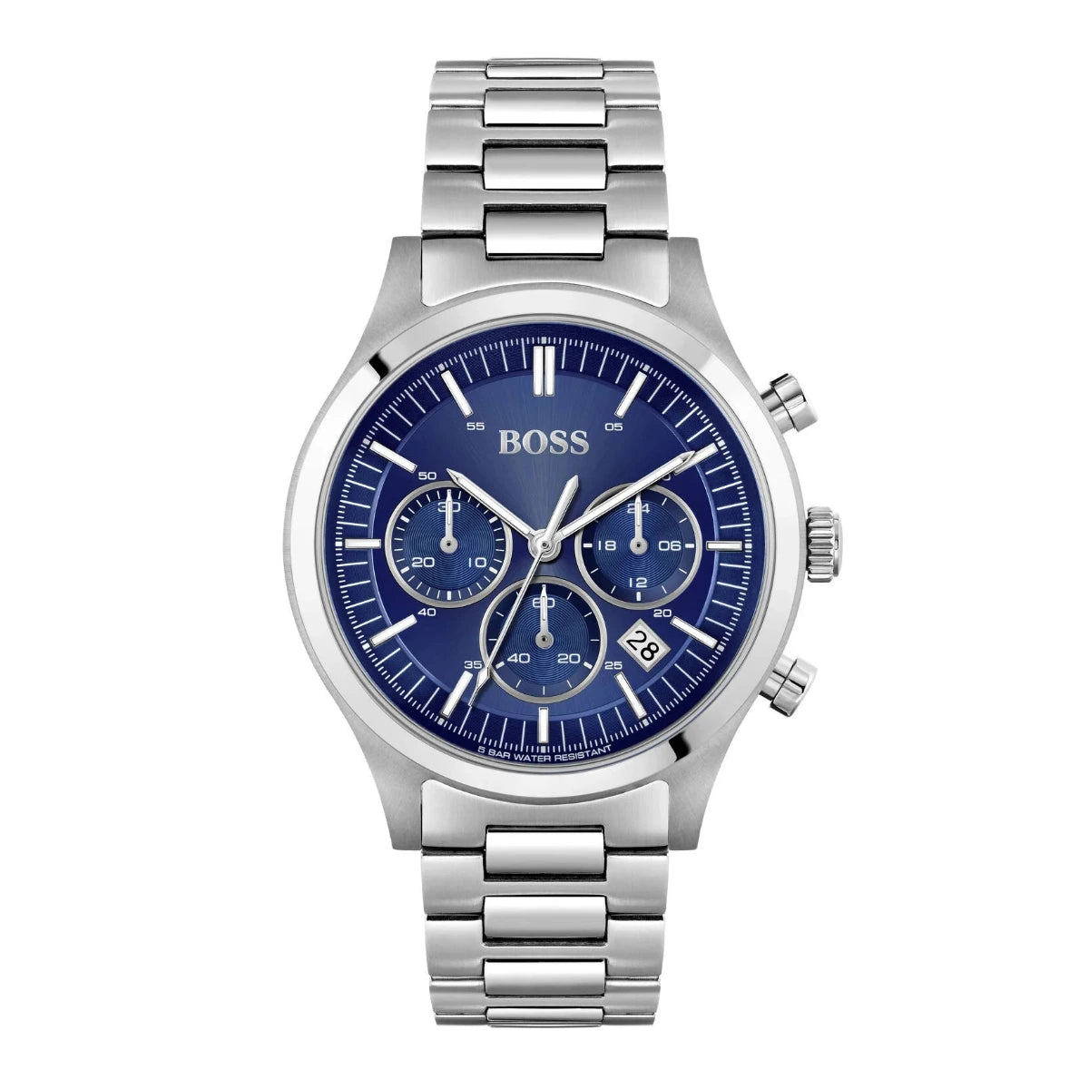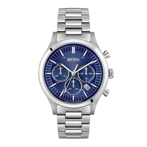 The classy Boss Metronome collection watch comes with quartz movement with mineral crystal glass. The rounded blue dial with 44 mm stainless steel case is attached to stainless steel bracelet with fold over with push button clasp. Water resistane upto 50 meters.