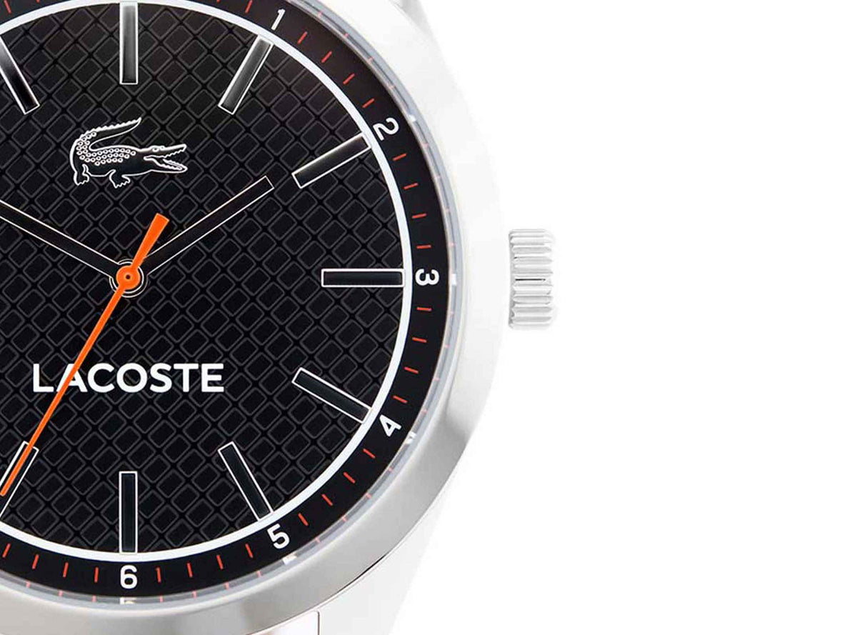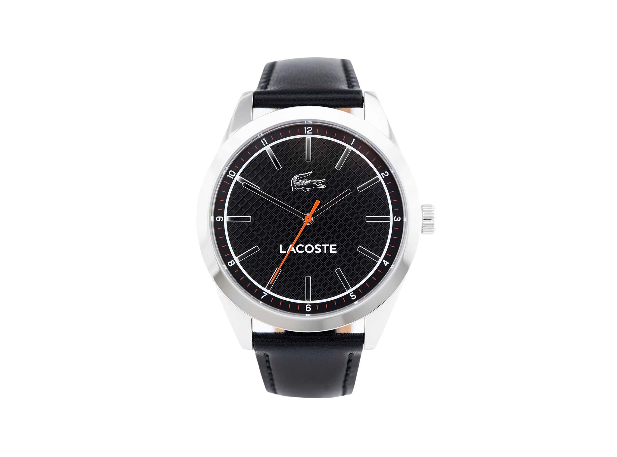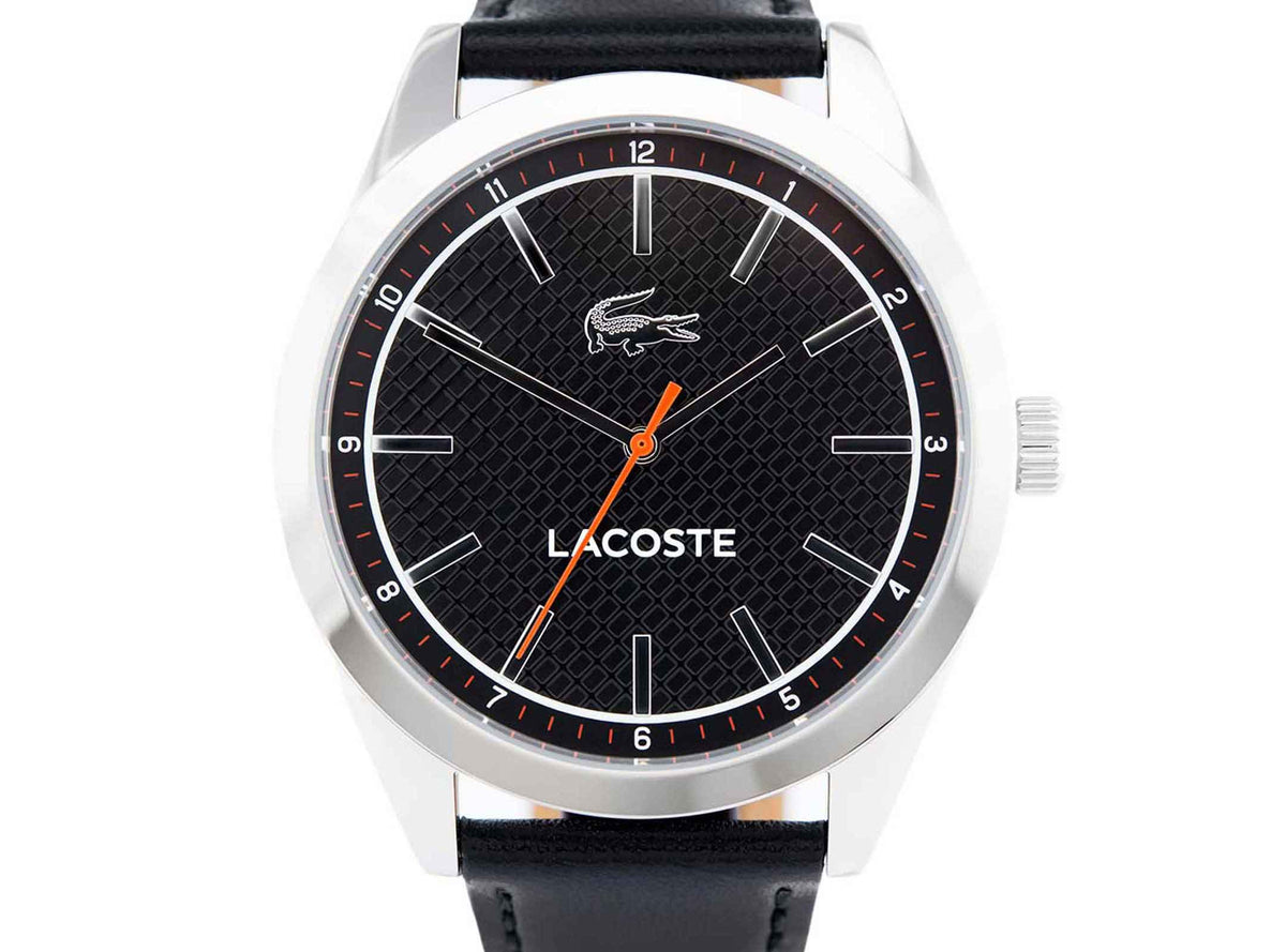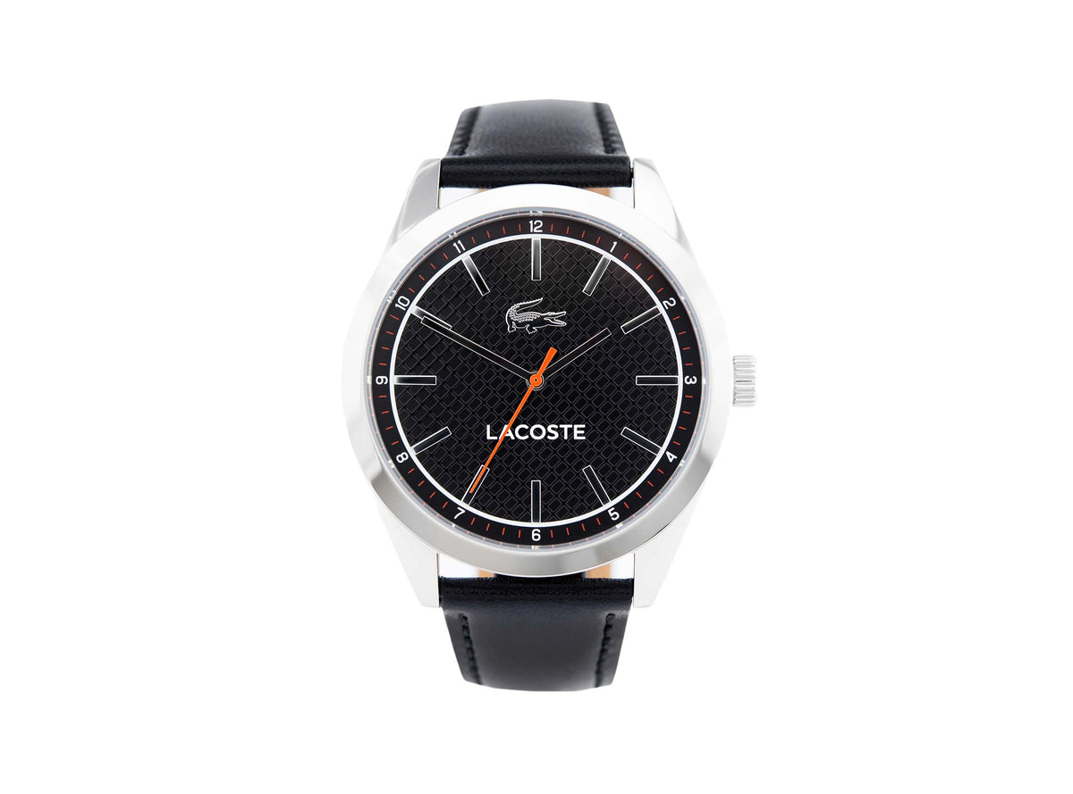 The Edmonton collection is a classic edition of Lacoste men's watches. The stainless steel case encloses a black dial with a silver color, tips, linear line index and the orange color of the second hand. Black, thread-sewn belt made of natural leather provides durability and comfort. The watch drives the quartz movement. Mineral glass with water tightness of the order of 3ATM protects the interior of the envelope from accidental splashes.