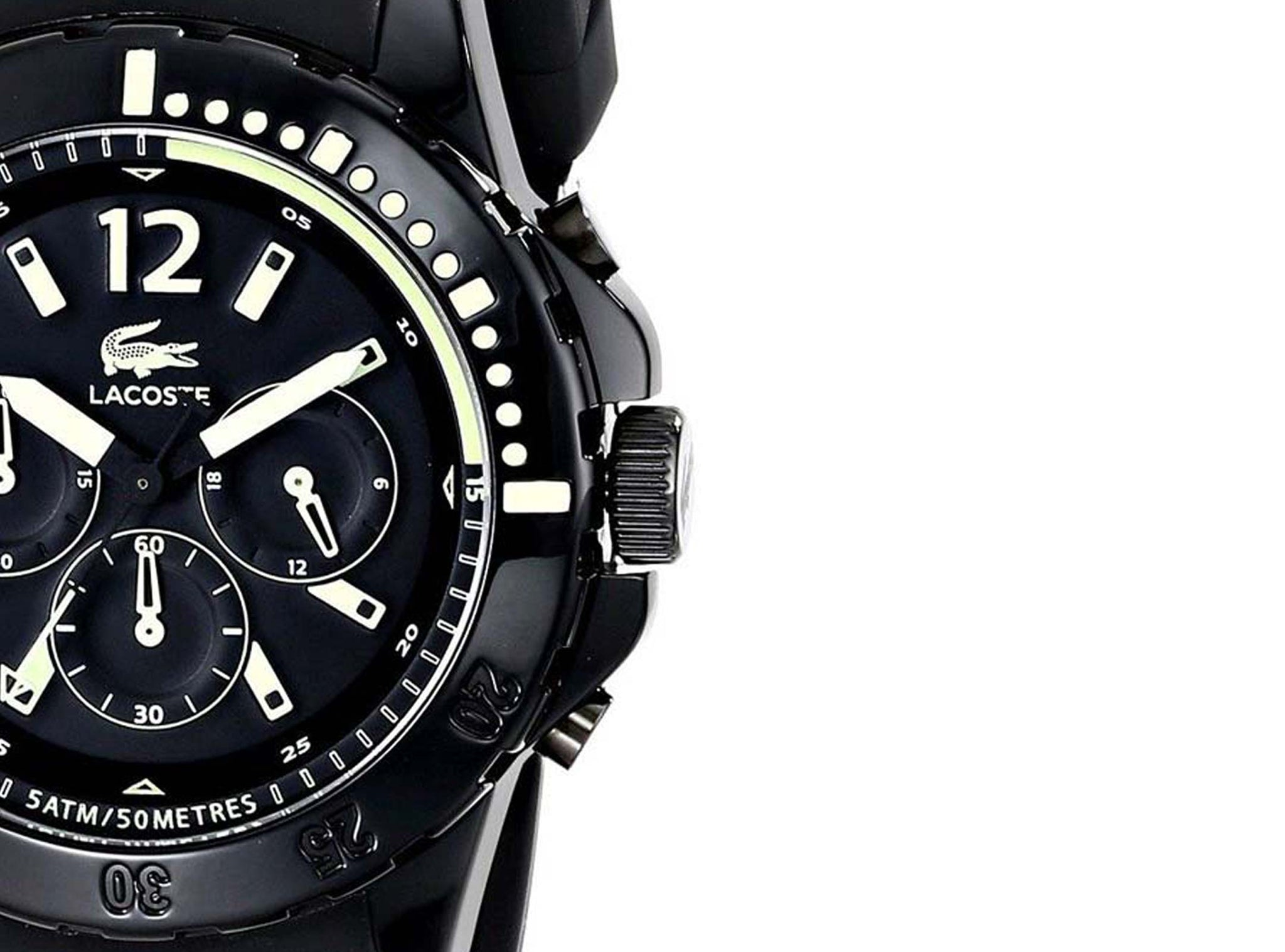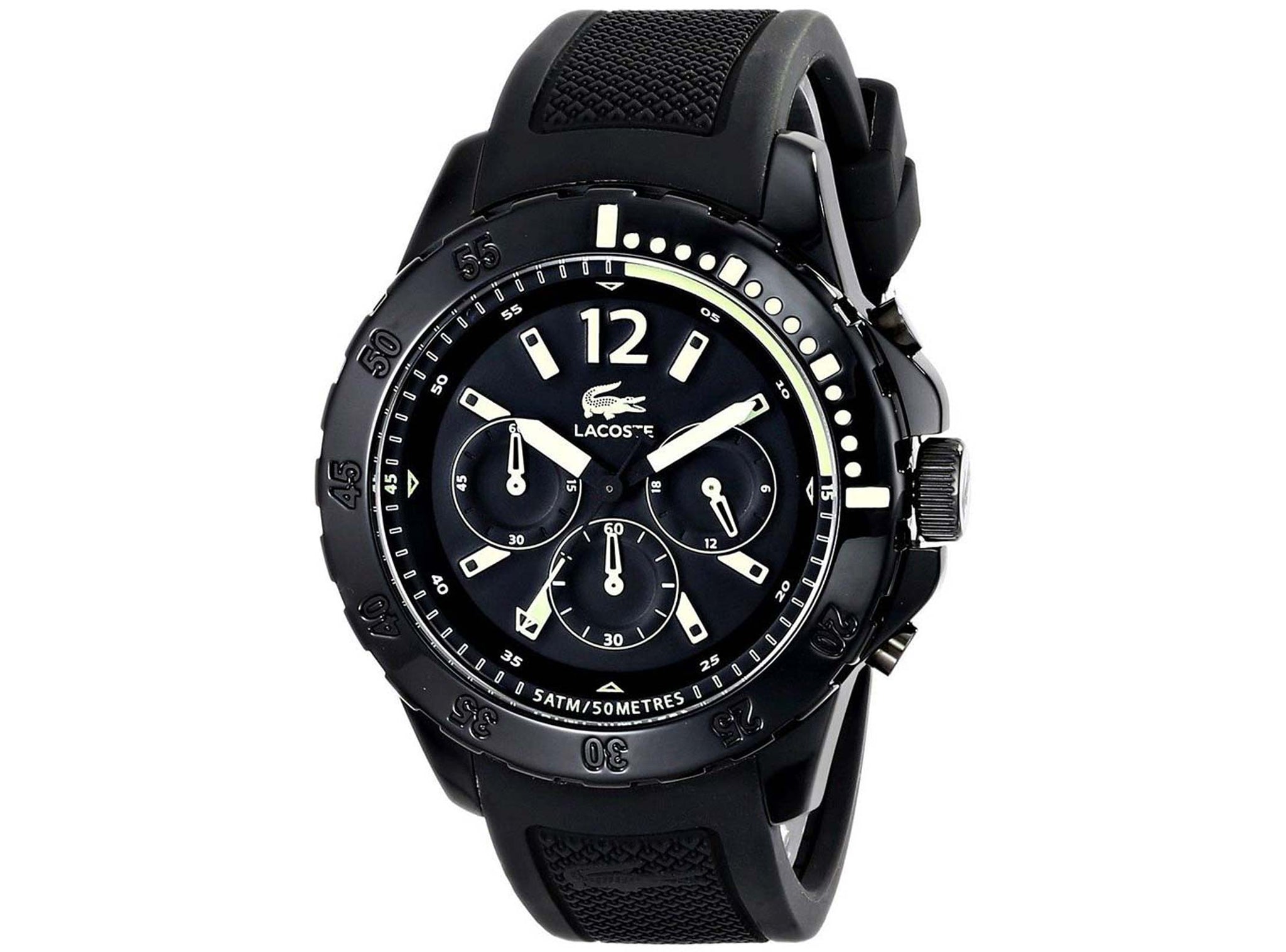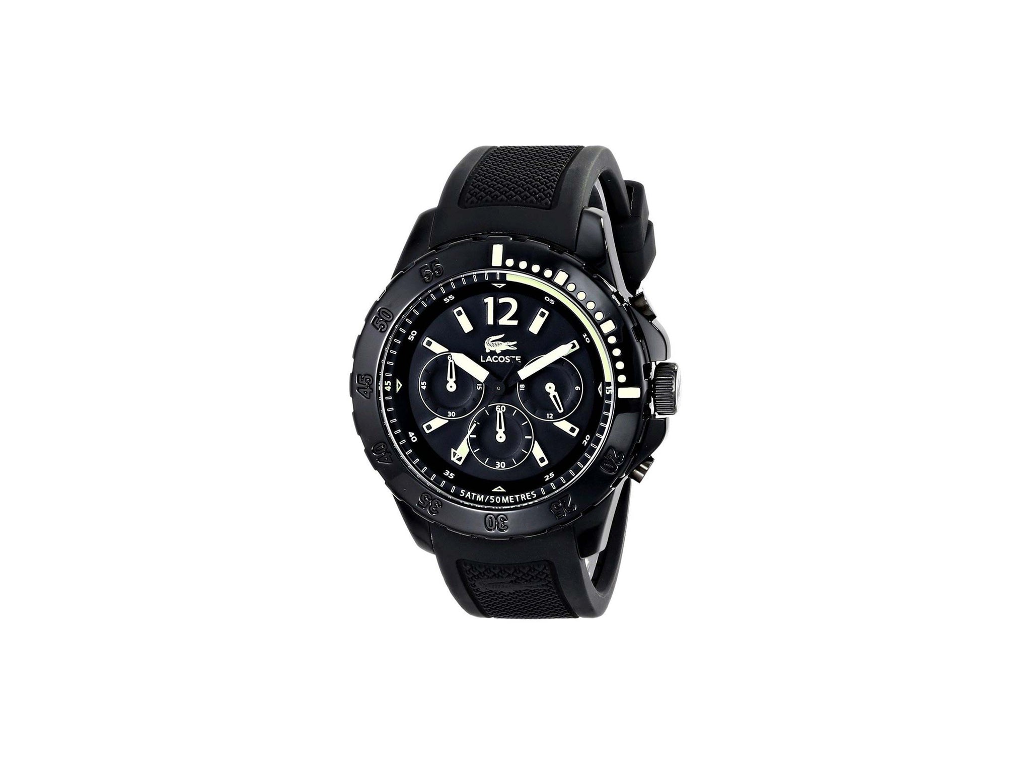 • This Lacoste Fidji 2010740 for men features a black chronograph dial with luminous hands, Arabic numeral at 12 o'clock position and stick indexes dial hour markers, minute markers around the outer rim, three subdials, signature croc and detail logo. It is set on a round black stainless steel case and matched with a black silicone strap.